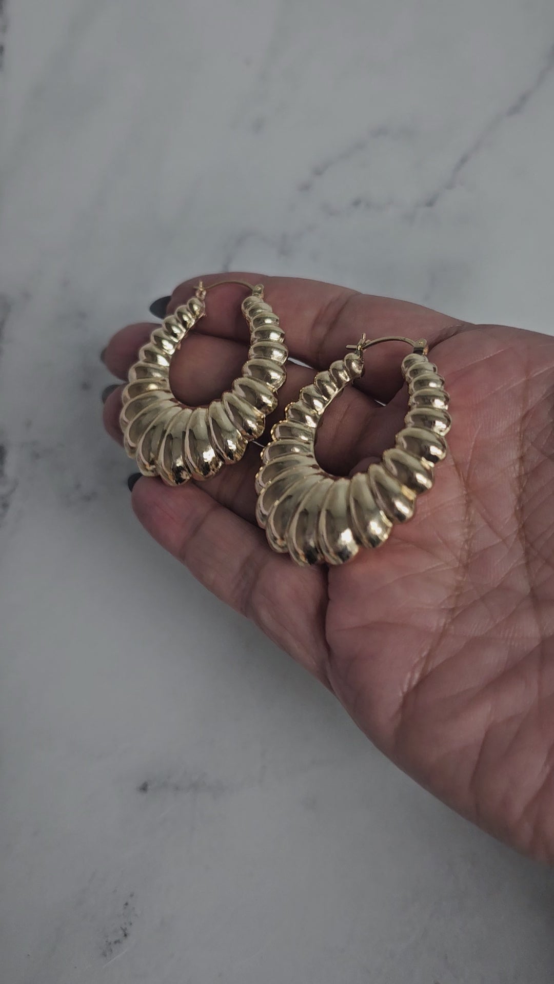 44MM Vintage Polished Puffy Shrimp Hoops 14k Yellow Gold