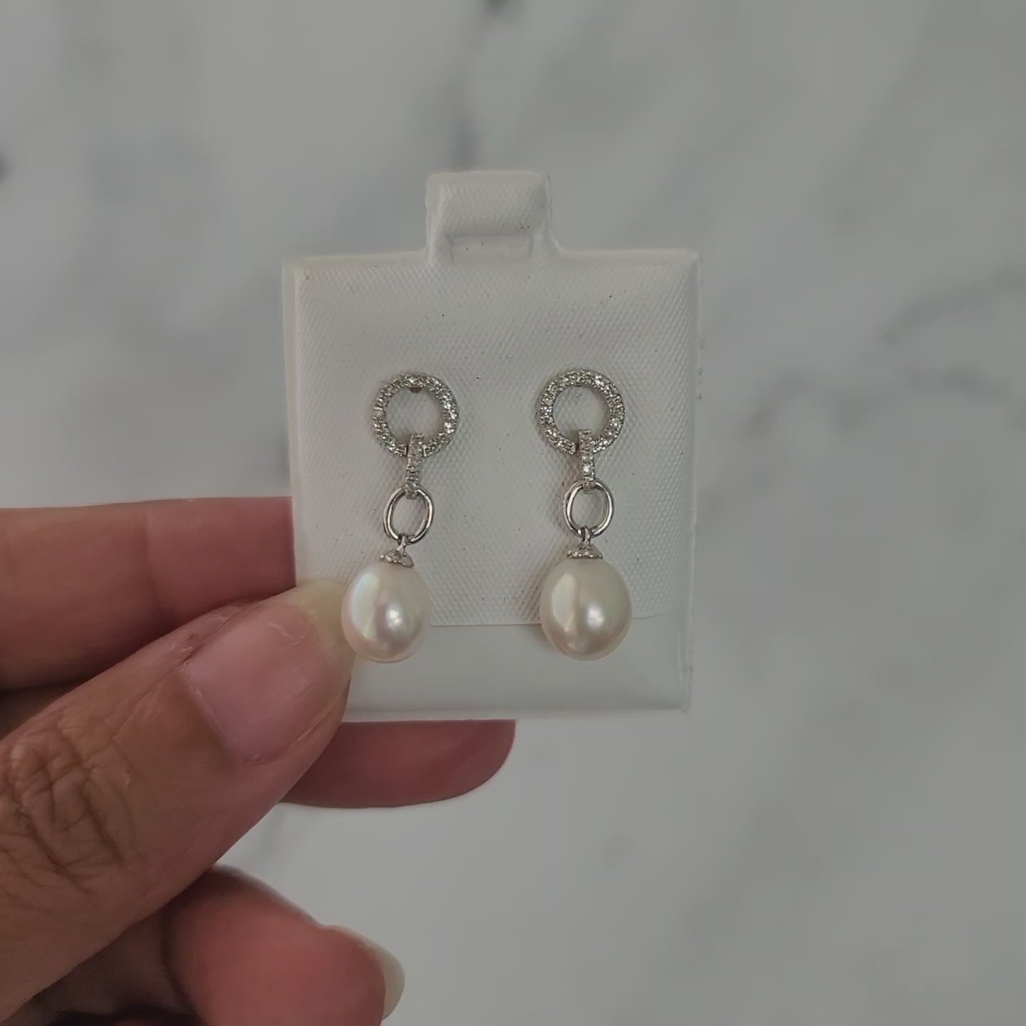 8MM Freshwater Pearl Diamond Drop Earrings .19cttw 14k White Gold