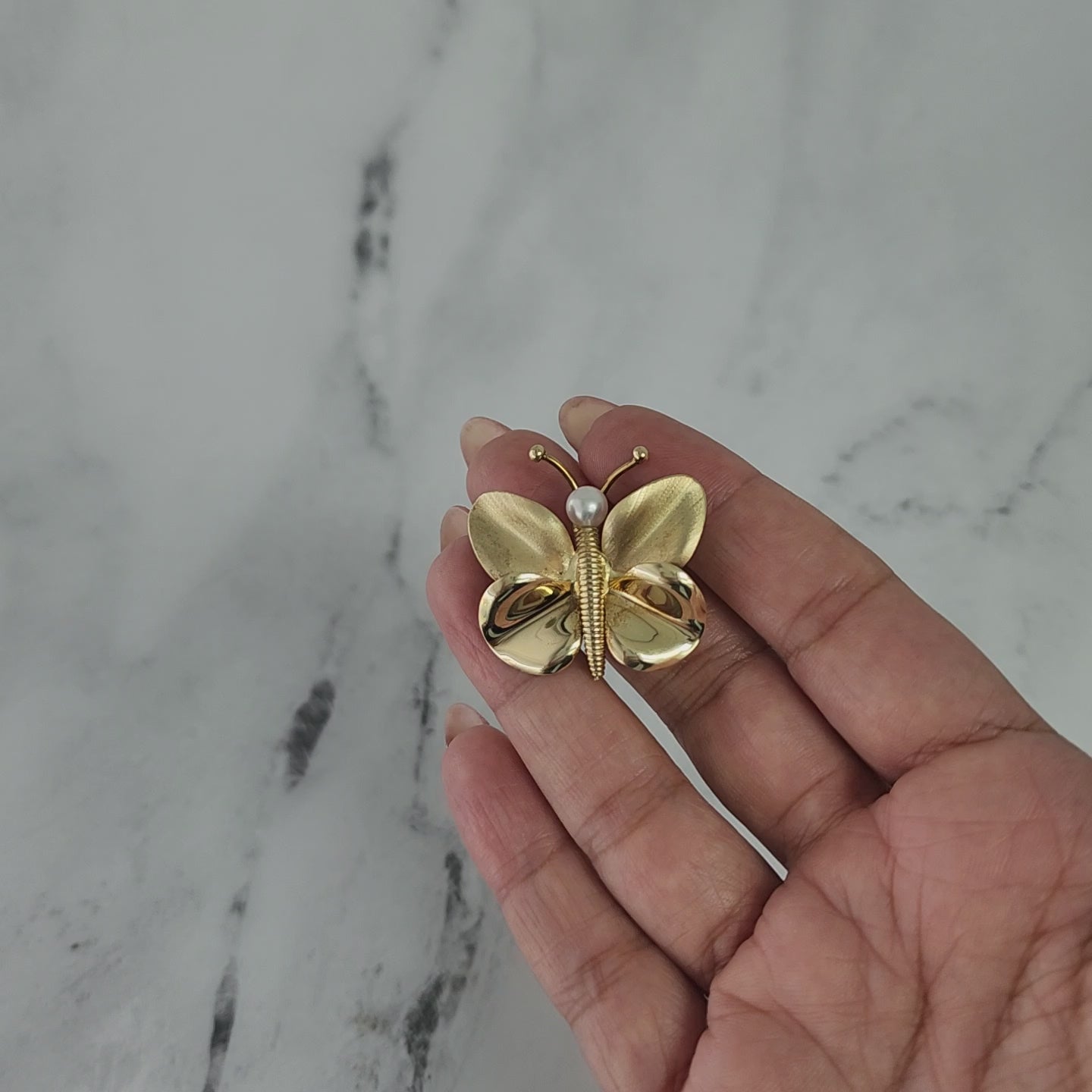 5MM Pearl Gold Butterfly Brooch 14k Yellow Gold