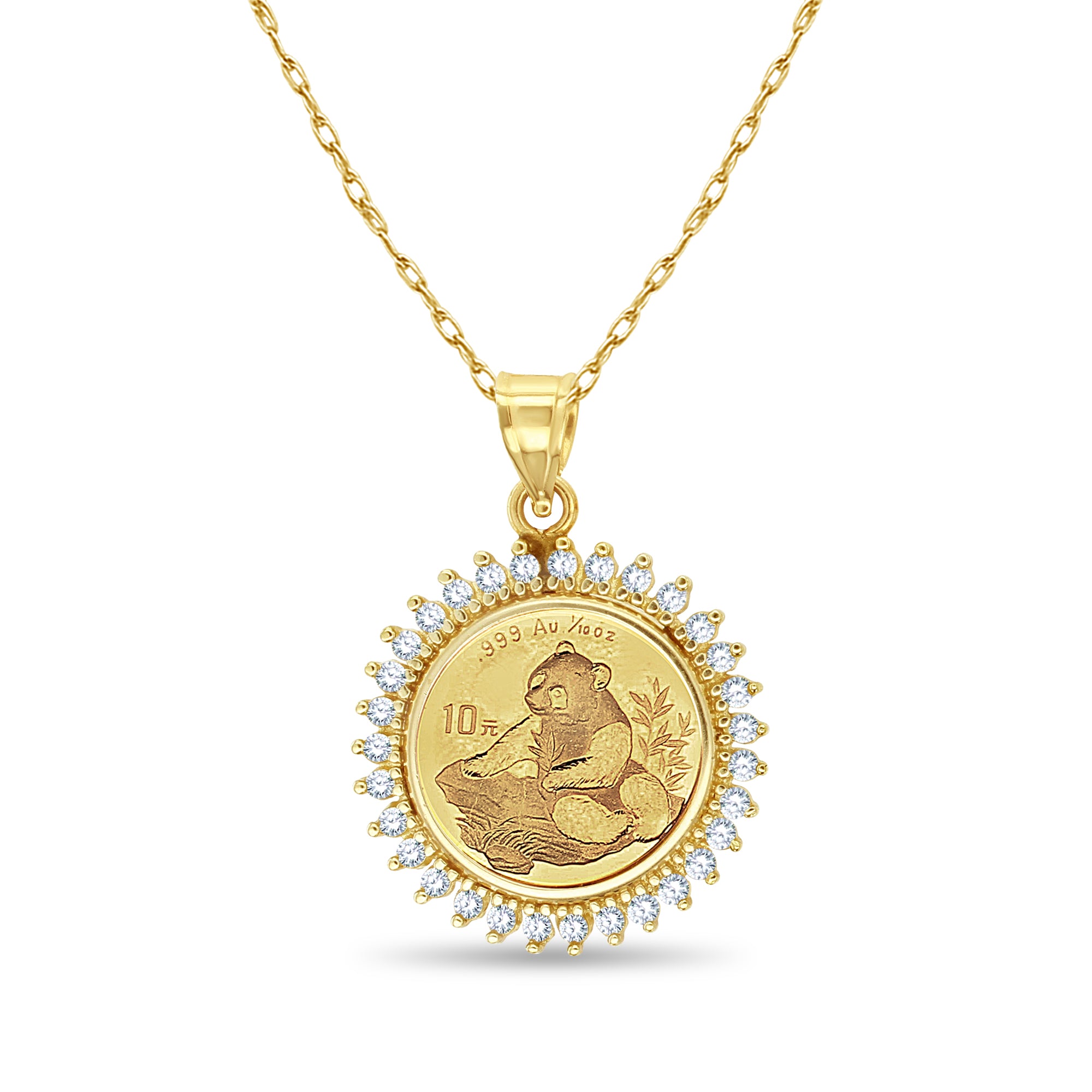 Collar con halo de diamantes y moneda de oro de panda chino de una décima de onza