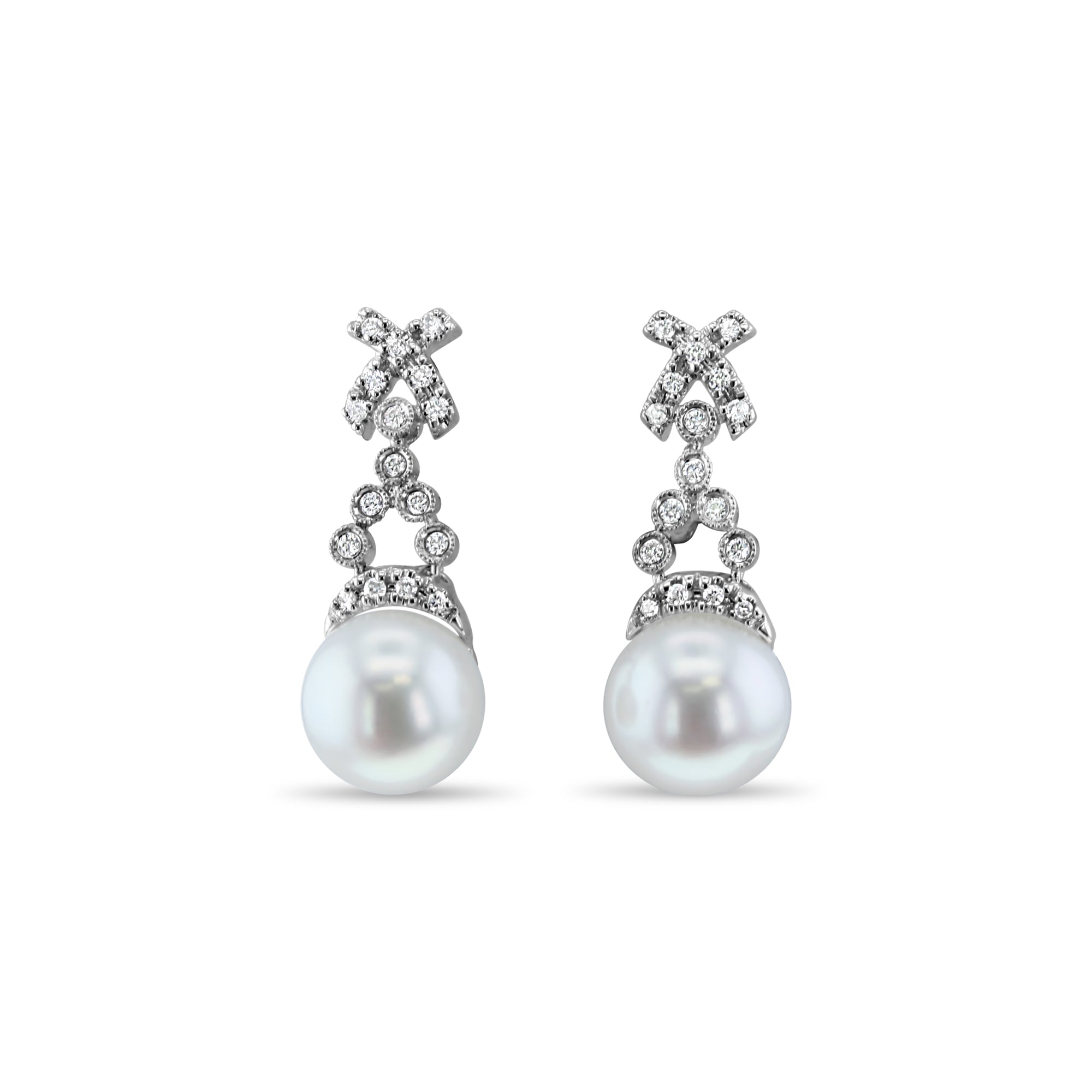 Pendientes pavé de diamantes y perlas en forma de X en oro blanco de 14 k
