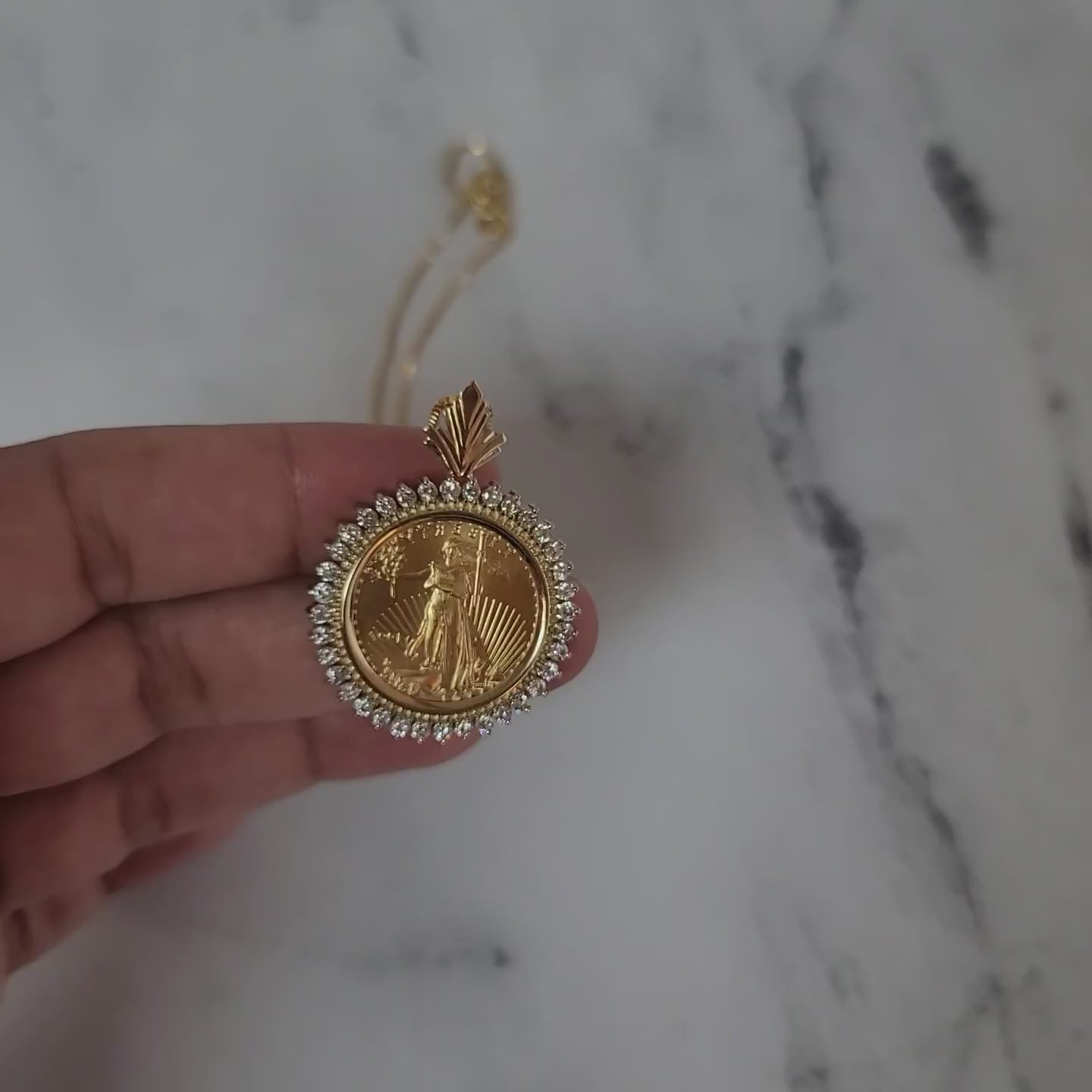 Collar con medallón de la Dama de la Libertad en oro fino de 1/4 oz con halo de diamantes