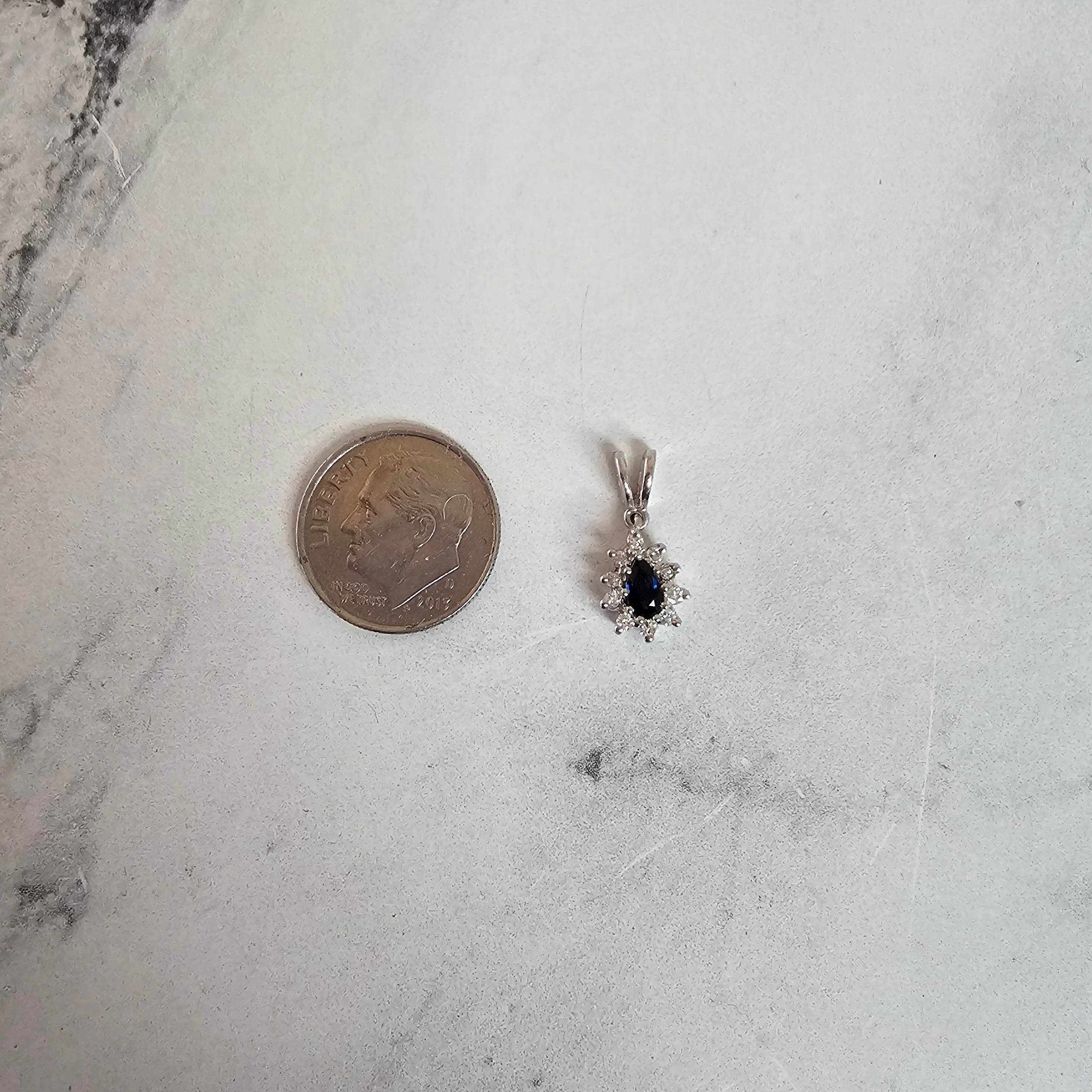 Delicado collar con halo de diamantes y zafiro en forma de pera en oro blanco de 14 k