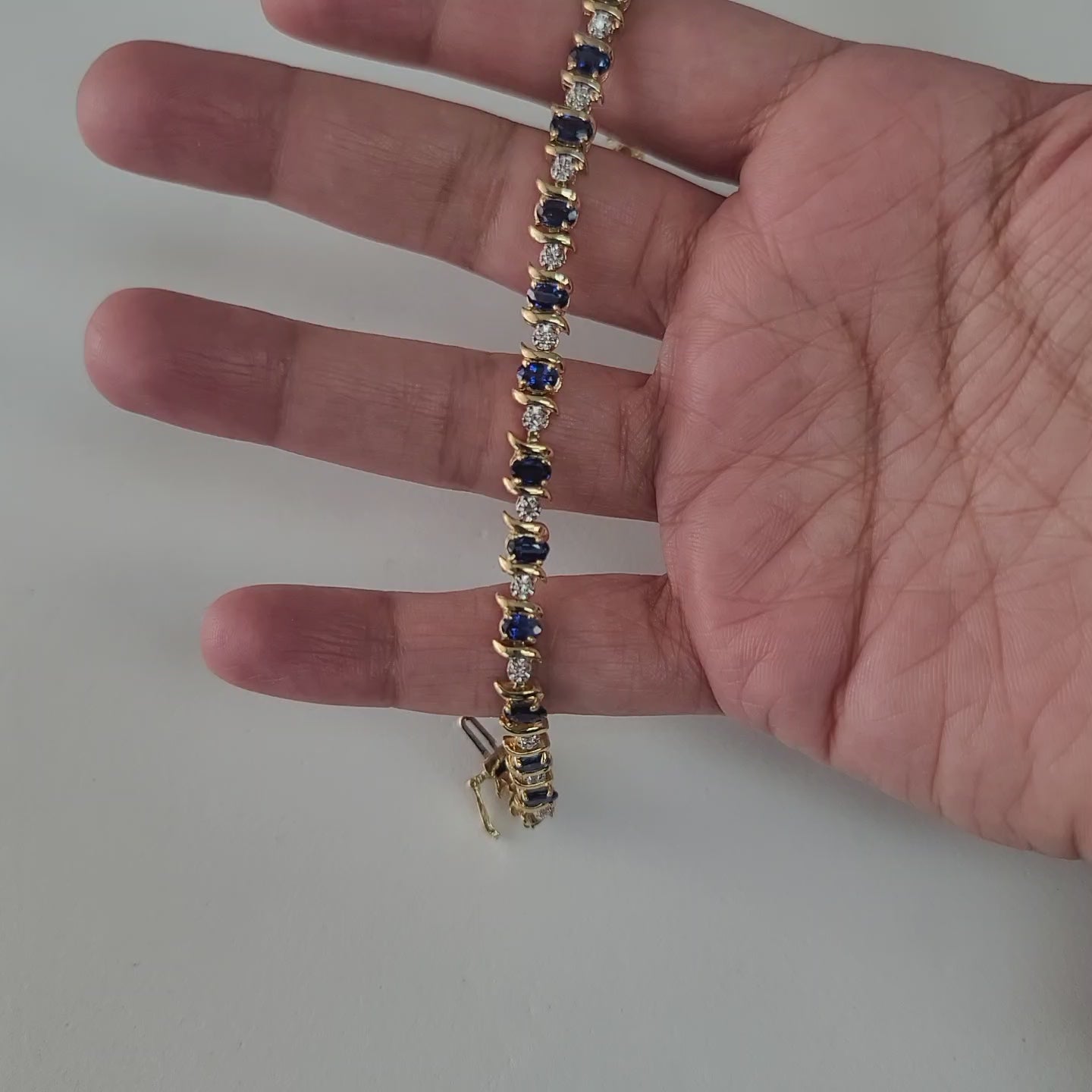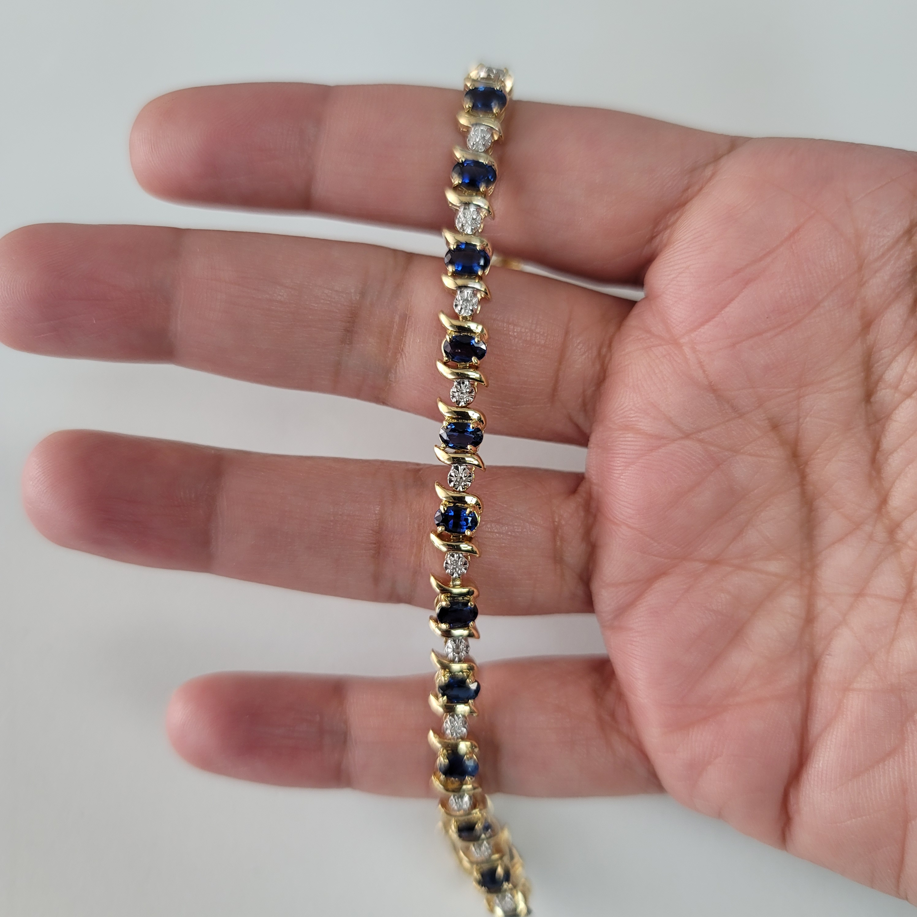 Pulsera de tenis con diamantes y zafiros ovalados en oro amarillo de 14 k