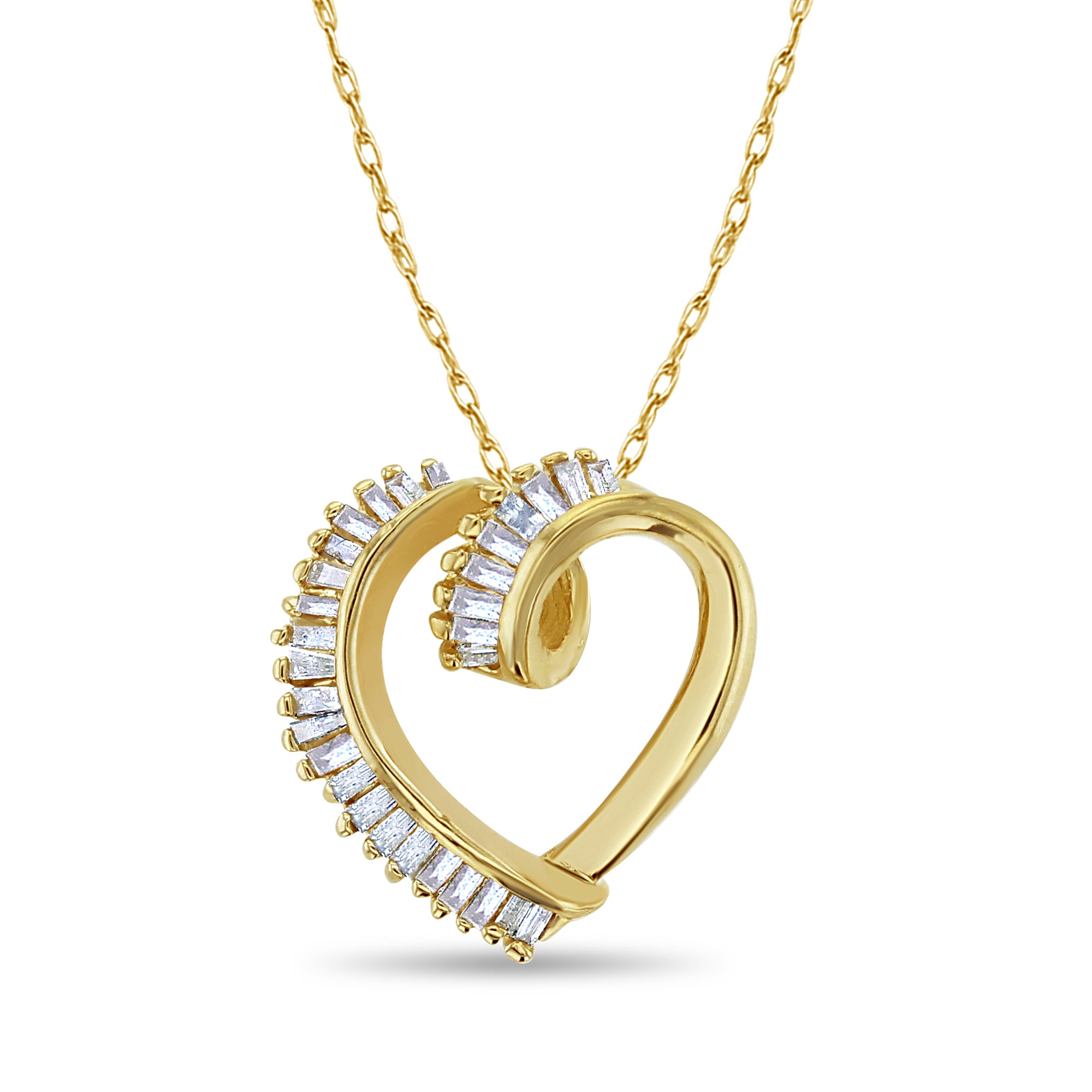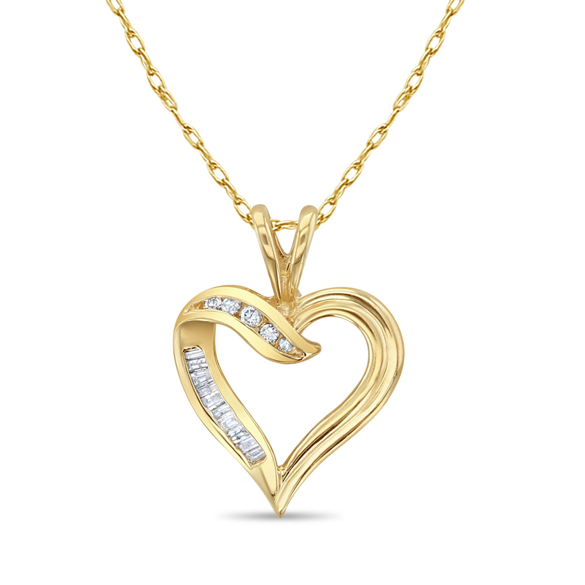 Collier en or jaune 14 carats avec diamants en forme de cœur et de baguette