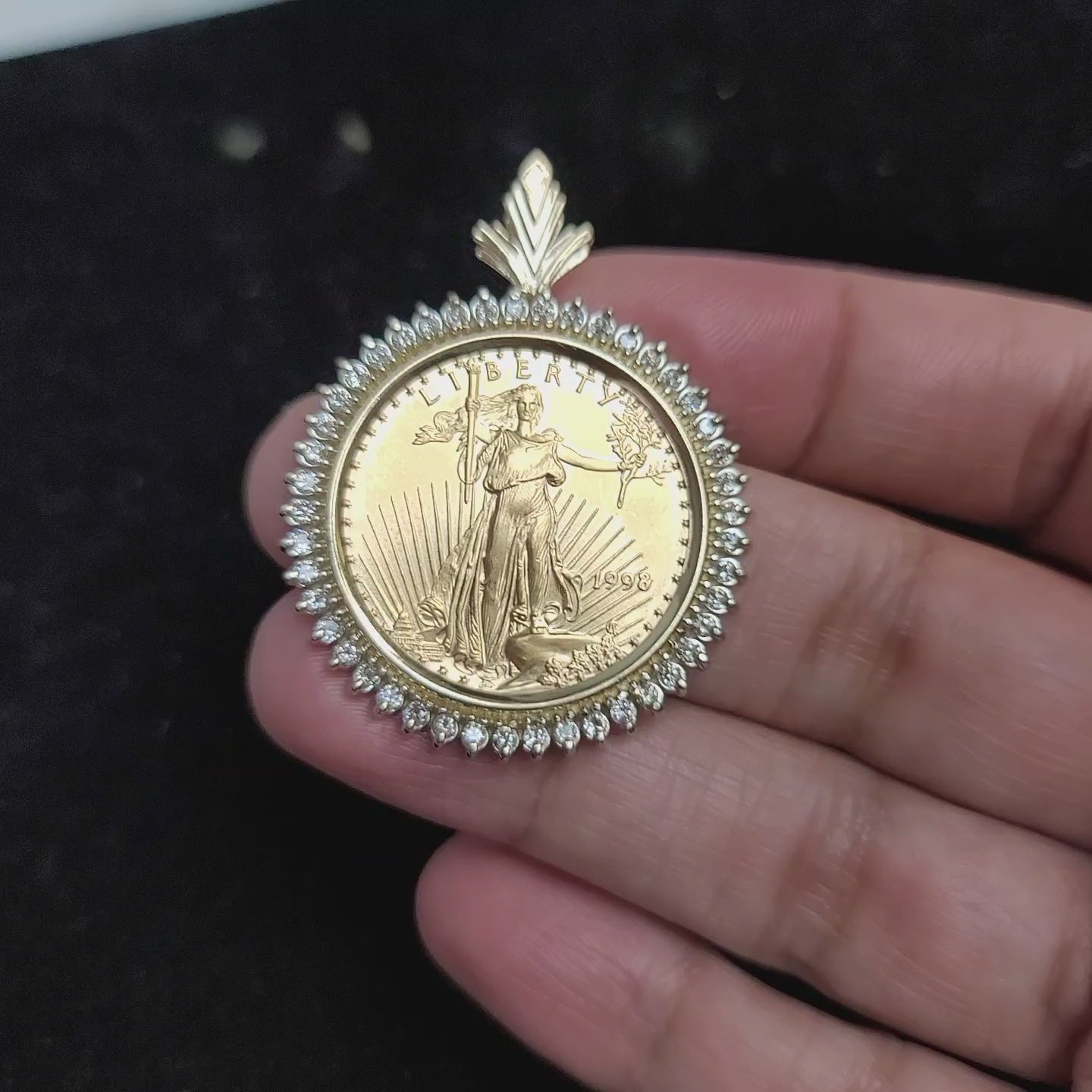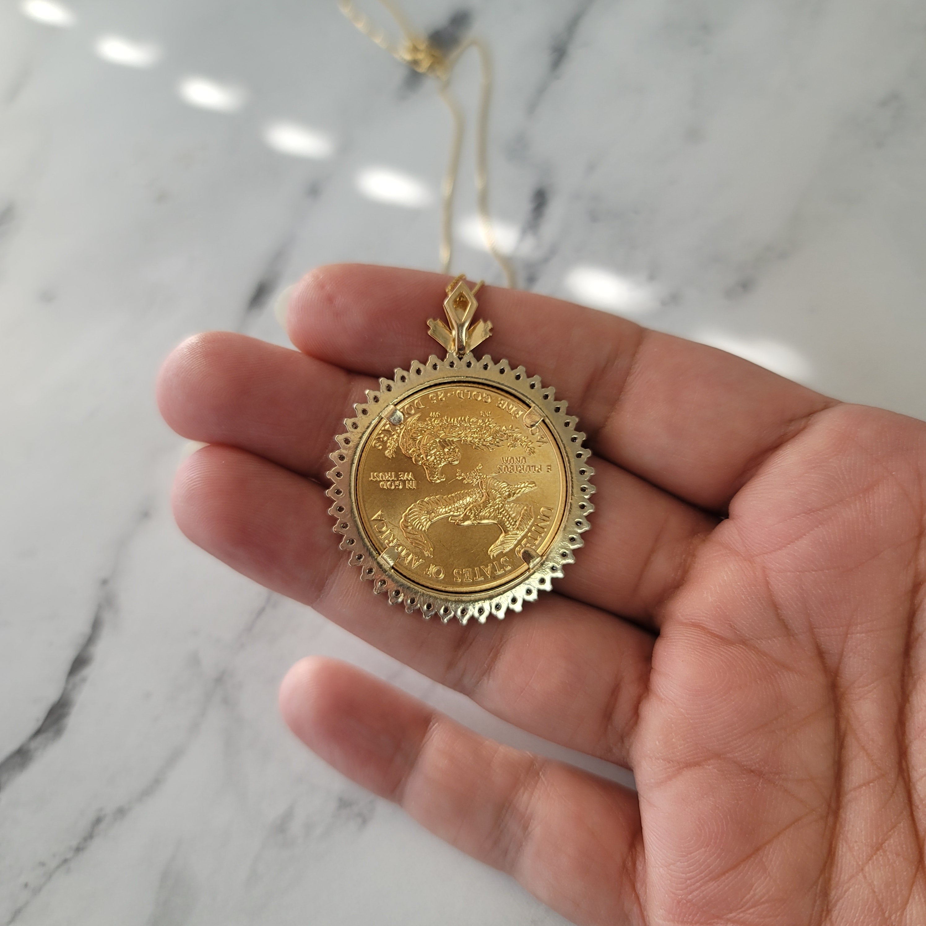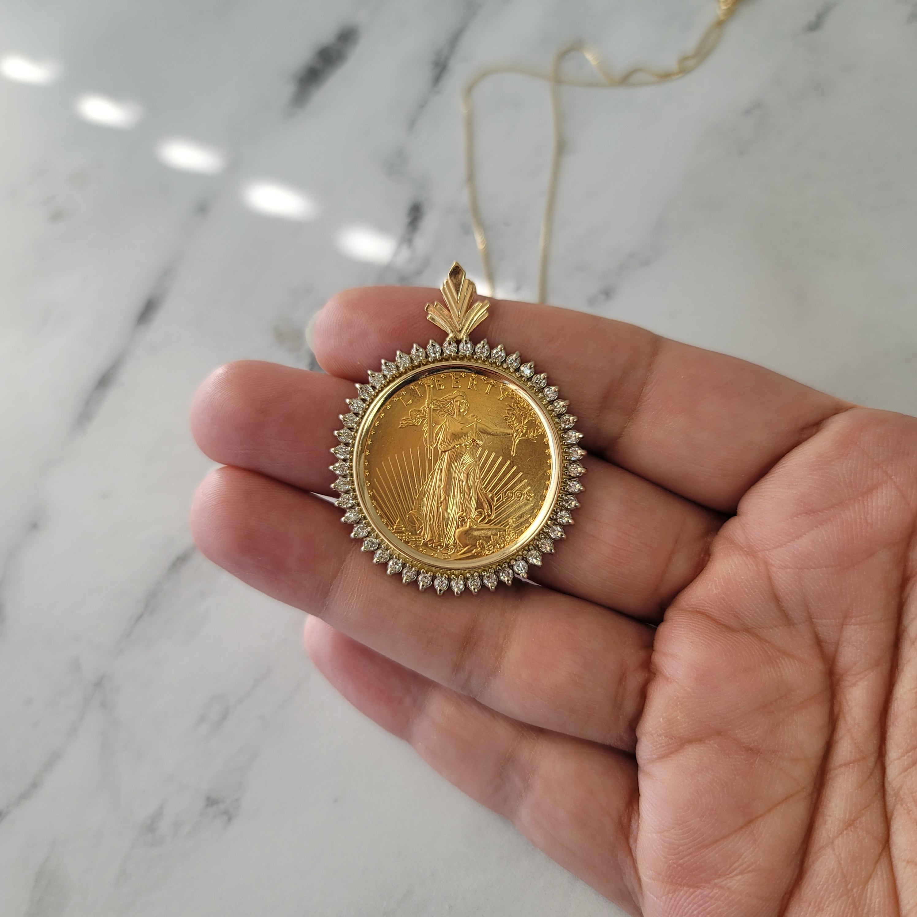 1/2OZ $25 Dollar 22K Fine Gold Lady Liberty Necklace with Diamond Halo