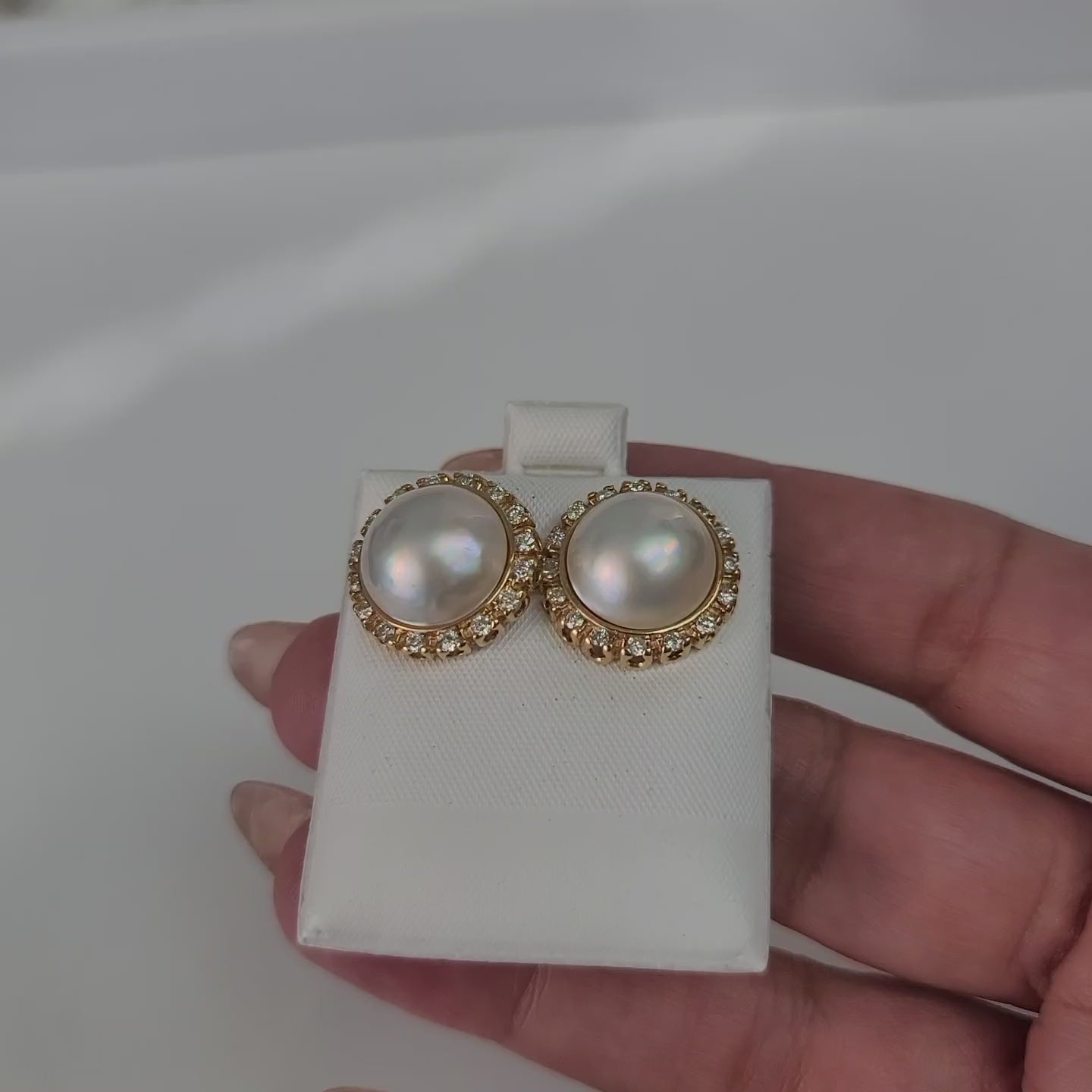 Mabe Pearl Diamond Halo Earrings .75cttw 14k Yellow Gold